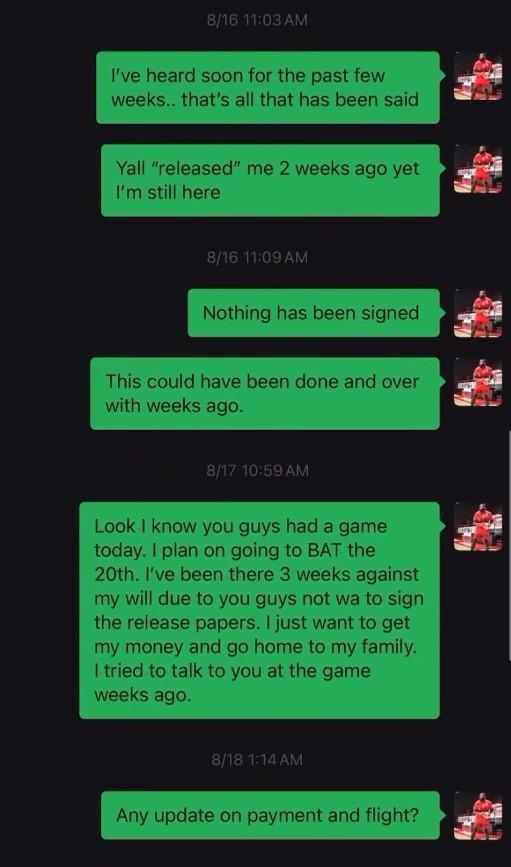 帕斯卡尔在社媒上晒出了他与石家庄翔蓝队总经理张适海的微信聊天记录,记录包括他加盟之初对方欢迎他加盟球队,到8月18日他被裁掉,对方表示将会很快支付薪金,直到目前已经三周时间他还没收到薪资,而他频频发问但却得不到回复